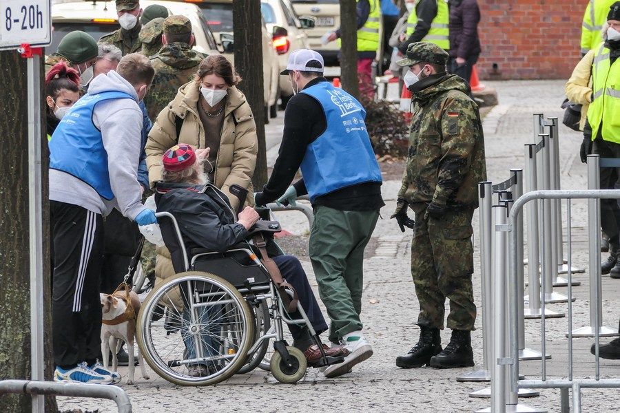 3月19日,在德国柏林,工作人员帮助一名乘坐轮椅的老人进入新冠疫苗接种中心。(新华社发,斯特凡·蔡茨摄)