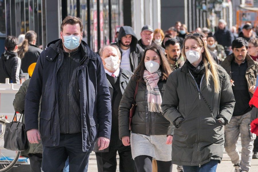 3月22日在德国首都柏林拍摄的戴口罩的行人。(新华社发,斯特凡·蔡茨摄)