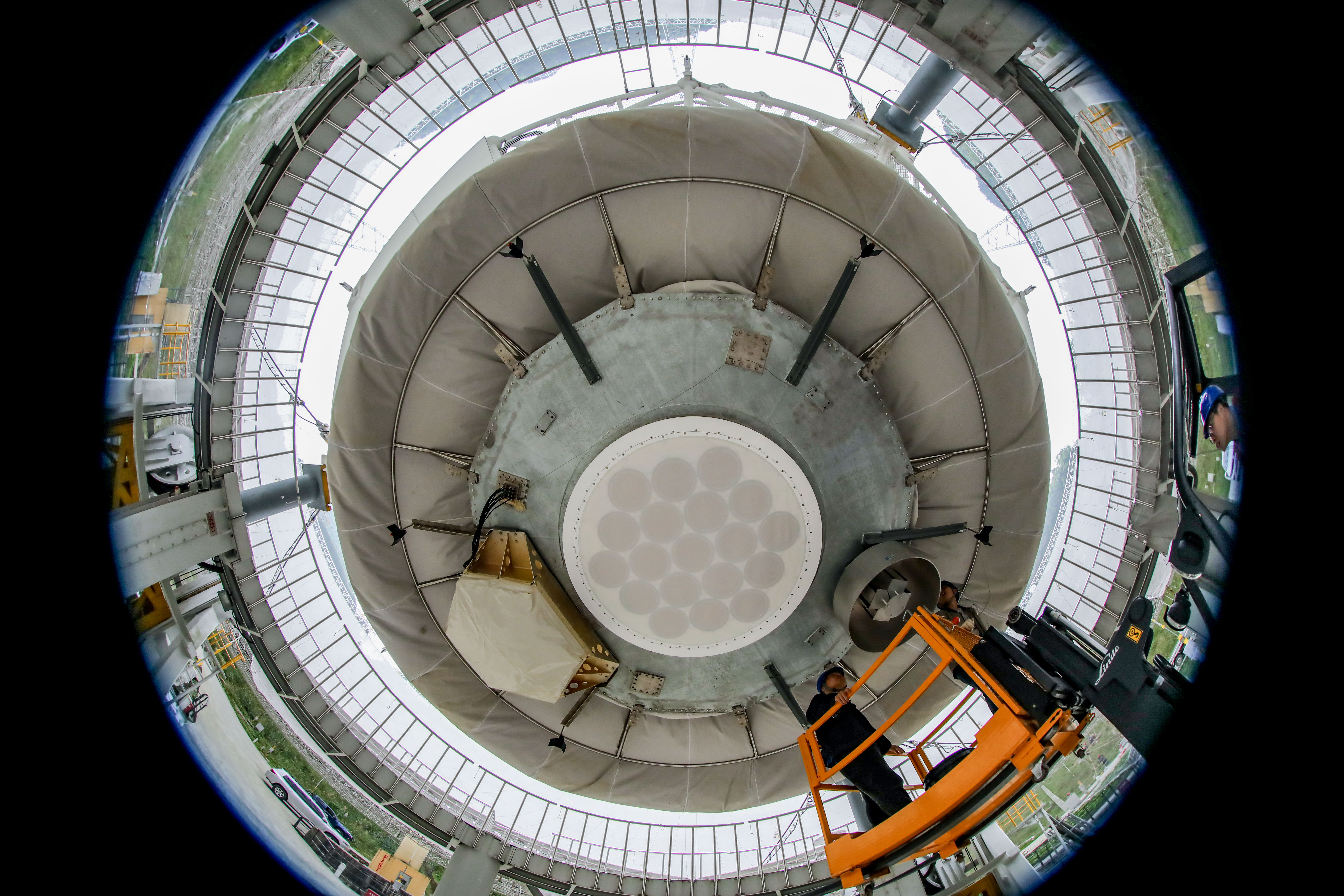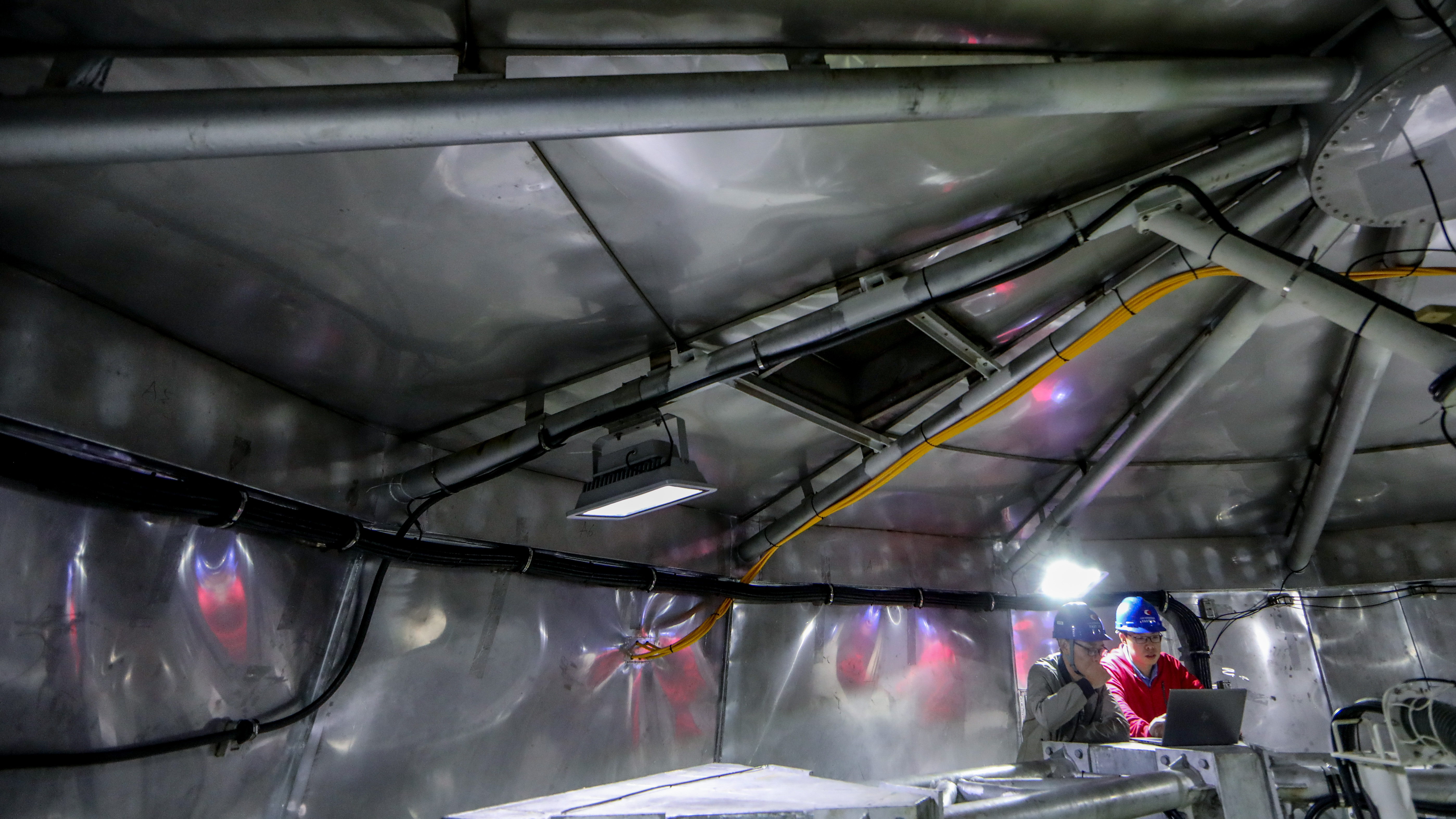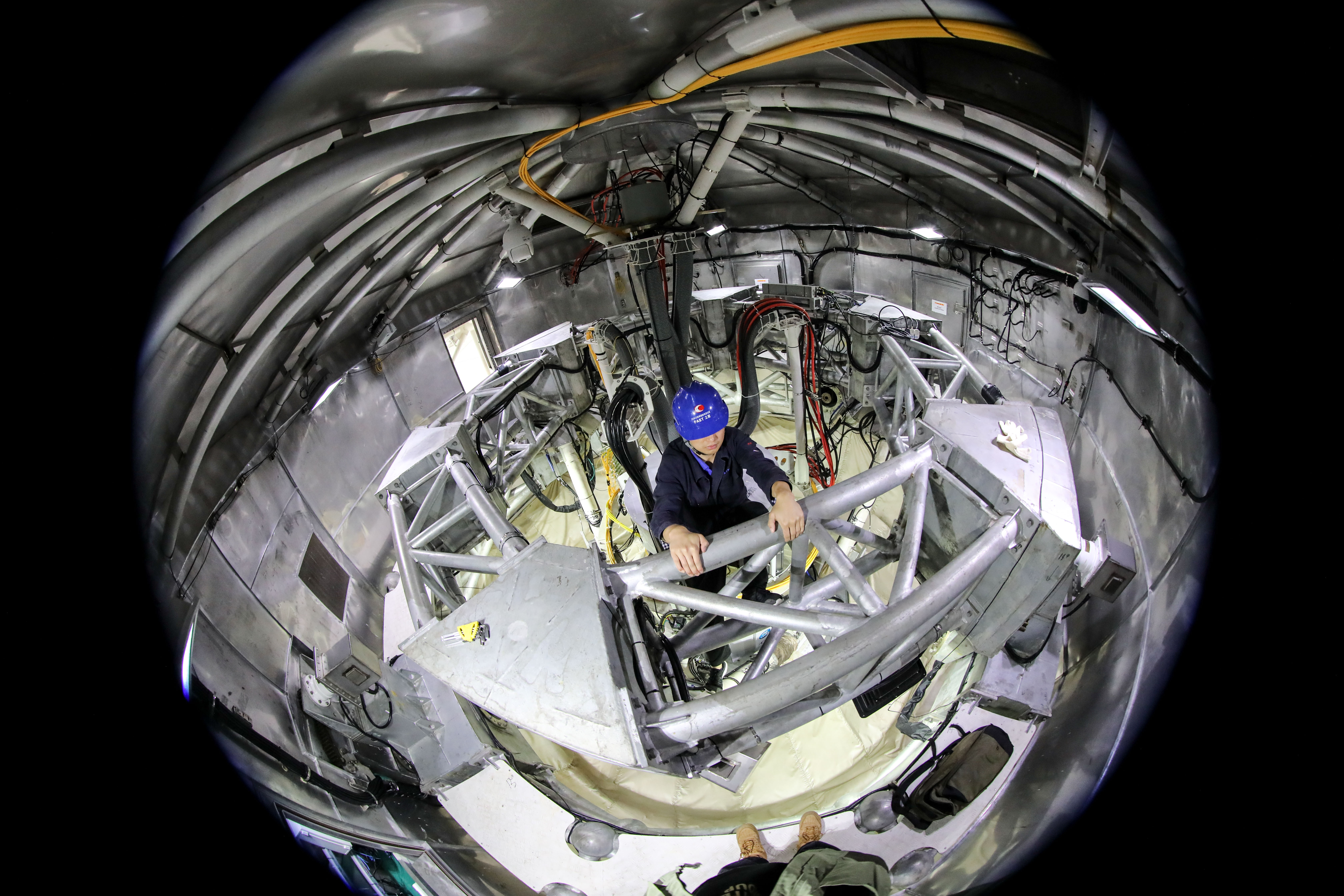 ↑3月28日,工作人员进入FAST馈源舱(鱼眼镜头拍摄)。