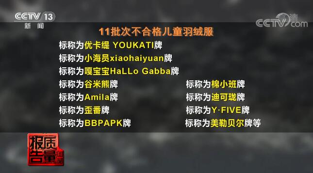 11批次儿童羽绒服不合格,包括标称为优卡缇牌、标称为谷米熊牌、标称为棉小班牌、标称为小海员牌等。