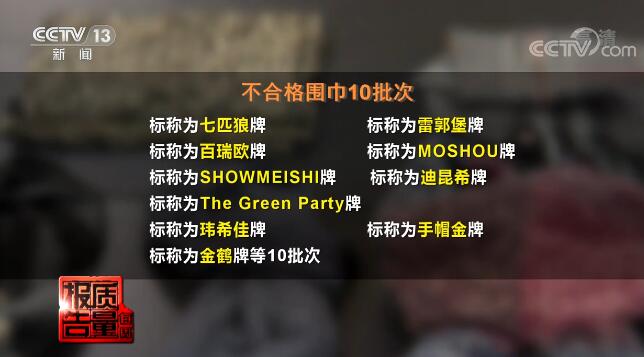 经过检测,不合格的围巾包括标称为七匹狼牌、标称为雷郭堡牌、标称为百瑞欧牌等10批次。