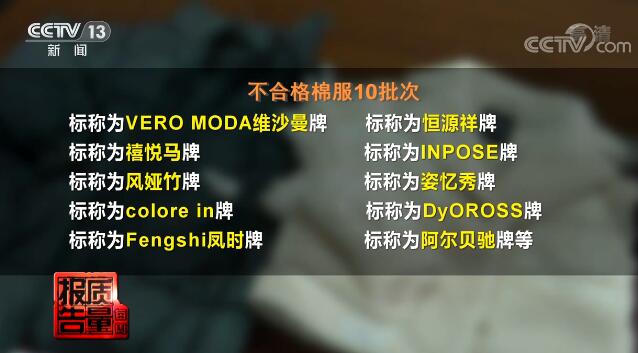经过检测,不合格的棉服包括标称为VERO MODA维沙曼牌、标称为恒源祥牌、标称为姿忆秀牌等10批次。