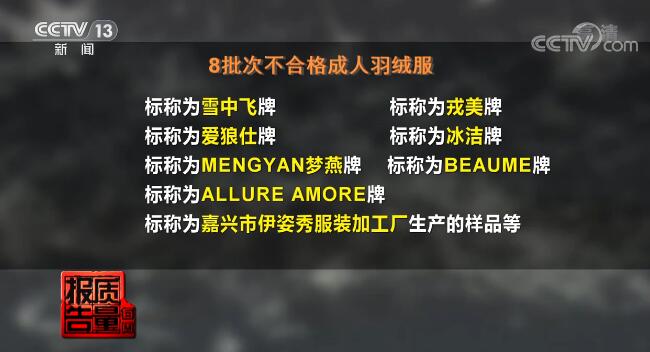 经过检测,8批次成人羽绒服不合格,包括标称为雪中飞牌、标称为戎美牌、标称为爱狼仕牌、标称为冰洁牌等样品。