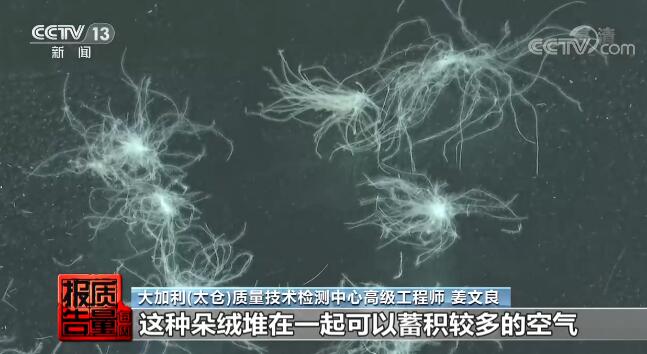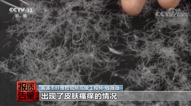 南通市纤维检验所高级工程师 钱薇薇:不成朵,我们的检测人员在检测过程中出现了皮肤瘙痒的情况,像这种填充物不仅保暖性能会比较差,消费者盖在身上有可能会引发皮肤瘙痒、鼻炎或者刺激呼吸道。