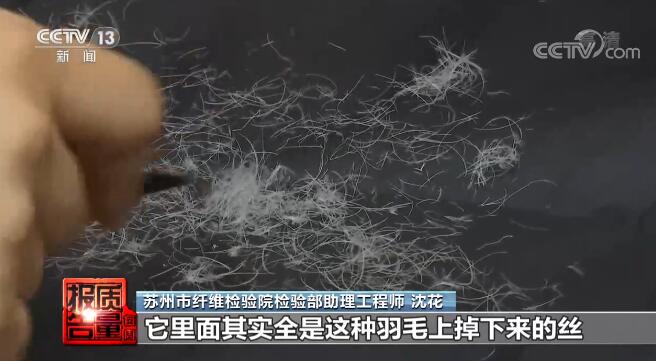 南通市纤维检验所高级工程师 钱薇薇:这条被子它给消费者看的这个看样,看上去还是蛮不错的绒子,但其实这条被子里面的填充物大多数都是这种粉碎性的毛绒。
