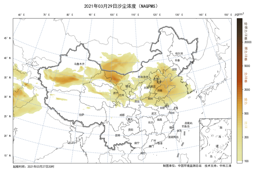 29—30日,预计沙尘主体将经我国华北东部地区出境,华北地区滞留沙尘受持续弱偏北风作用影响范围可能进一步扩大至华中及长三角地区,河南大部、安徽北部和江苏北部等地可能出现PM10为首要污染物的中度及以上污染过程。华北地区可能存在有部分沙尘回流及滞留风险,区域大部以轻至中度污染为主,个别城市可能仍维持重度污染,首要污染物为PM10。