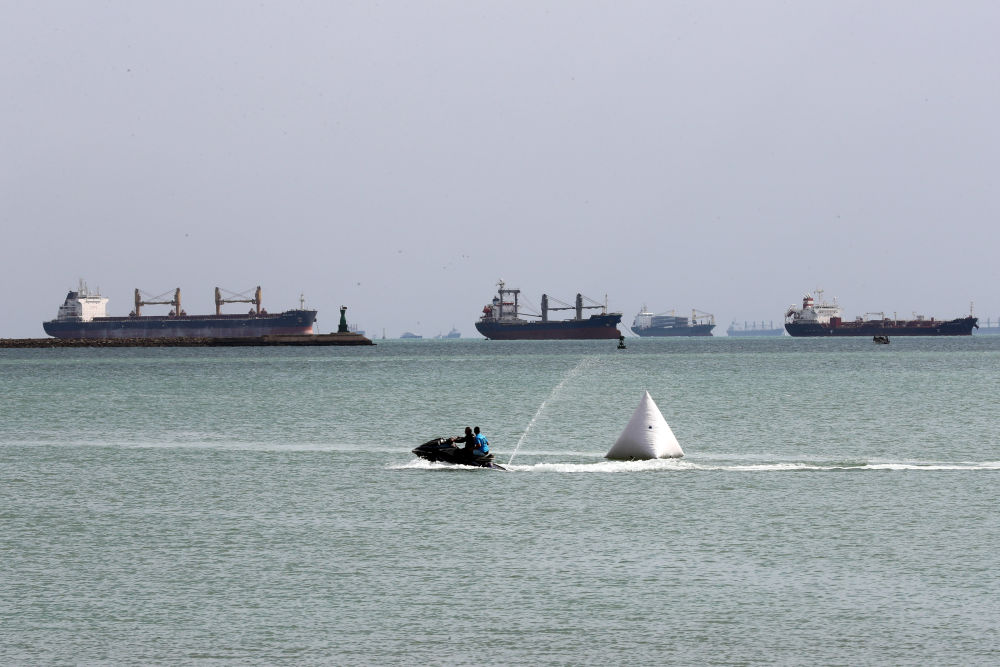 这是3月26日拍摄的停泊在埃及苏伊士湾上等待通过苏伊士运河的船只。(新华社发,艾哈迈德·戈马摄)