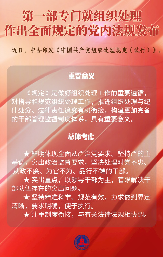 近日,中共中央办公厅印发《中国共产党组织处理规定(试行)》。这是第一部专门就组织处理作出全面规定的党内法规。