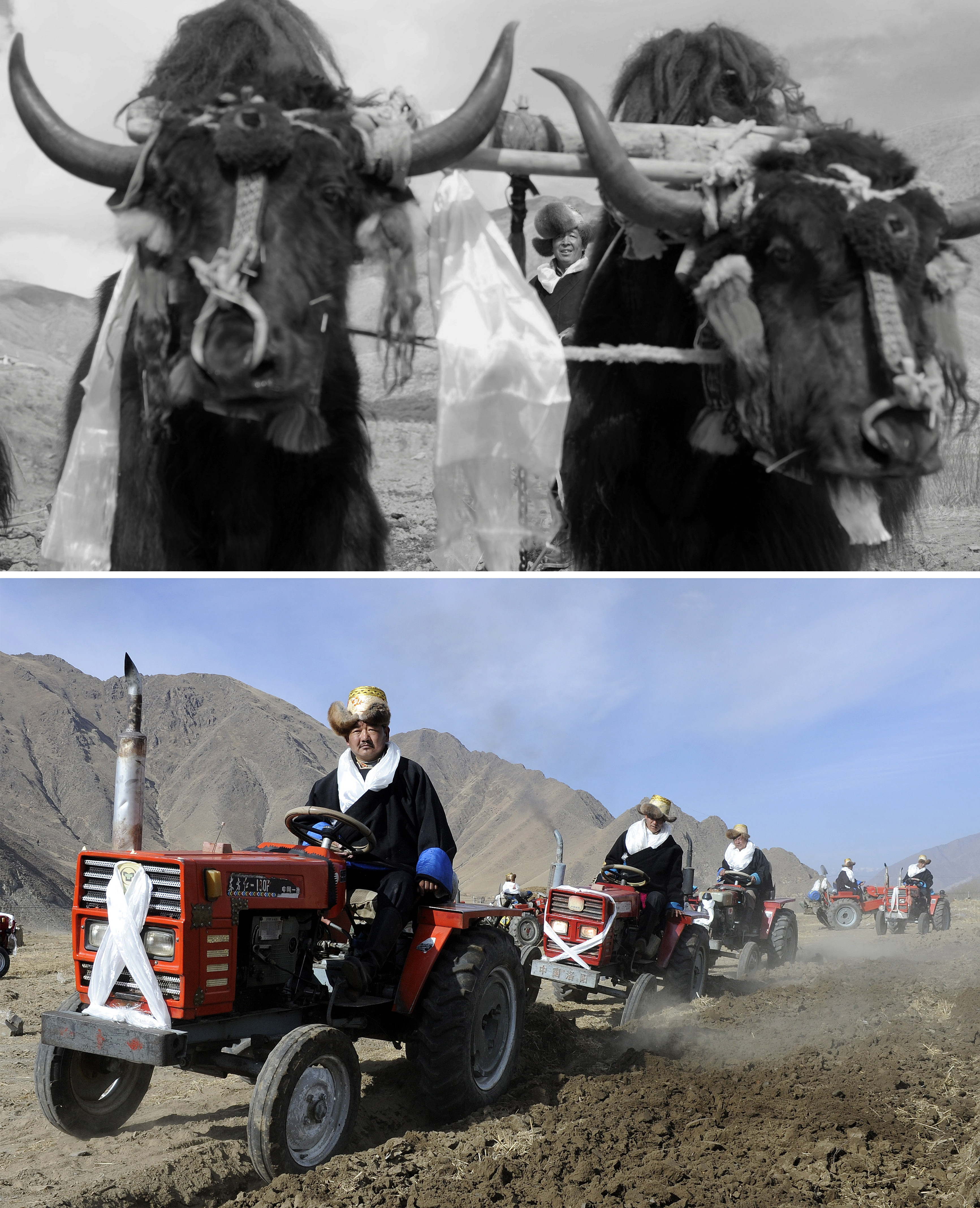 上世纪70年代,拖拉机第一次进“公社”大院,藏族人民以迎接“新娘”的隆重仪式迎接“铁牛”。