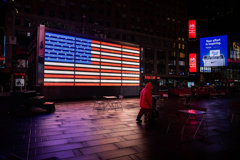 3月24日,清洁工走在美国纽约时报广场。美国约翰斯·霍普金斯大学24日发布的新冠疫情最新统计数据显示,截至美国东部时间24日18时27分(北京时间25日6时27分),美国累计确诊病例30001245例,累计死亡病例545053例。美国是全球累计确诊病例数和累计死亡病例数最多的国家。(新华社发 郭克摄)