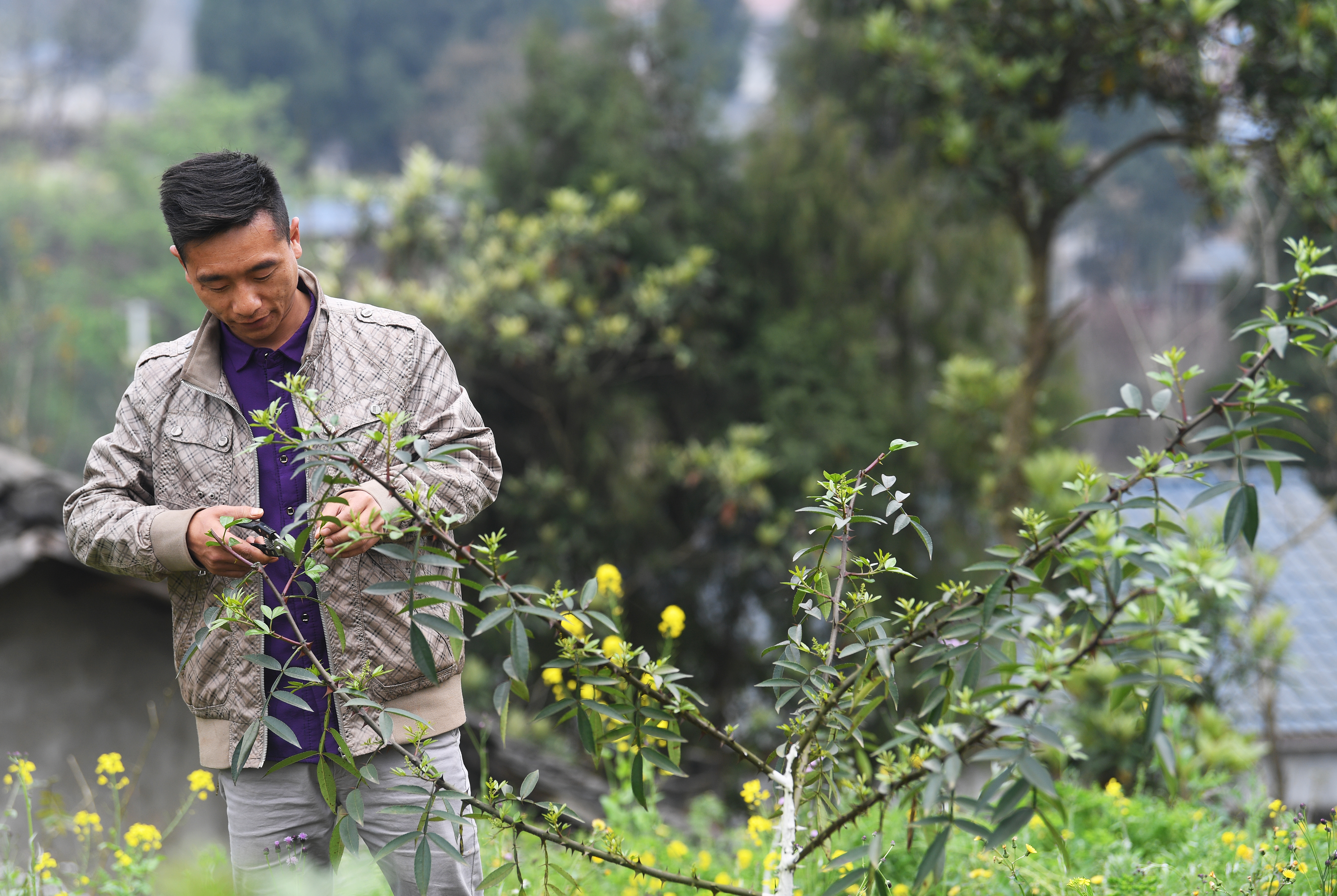 双江镇管店村村民全清杰在花椒种植基地管护花椒。新华社记者王全超摄