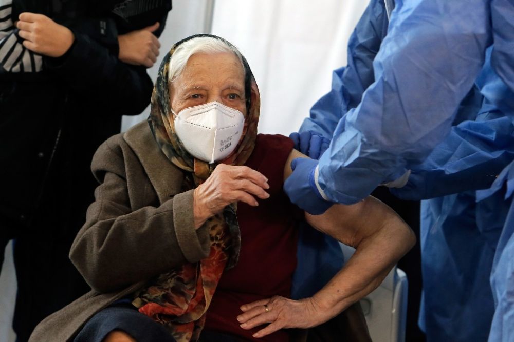 3月28日,105岁的巴尔塔格老妪正在罗马尼亚首都布加勒斯特接受第二剂新冠疫苗接种。(新华社发,克里斯泰尔摄)