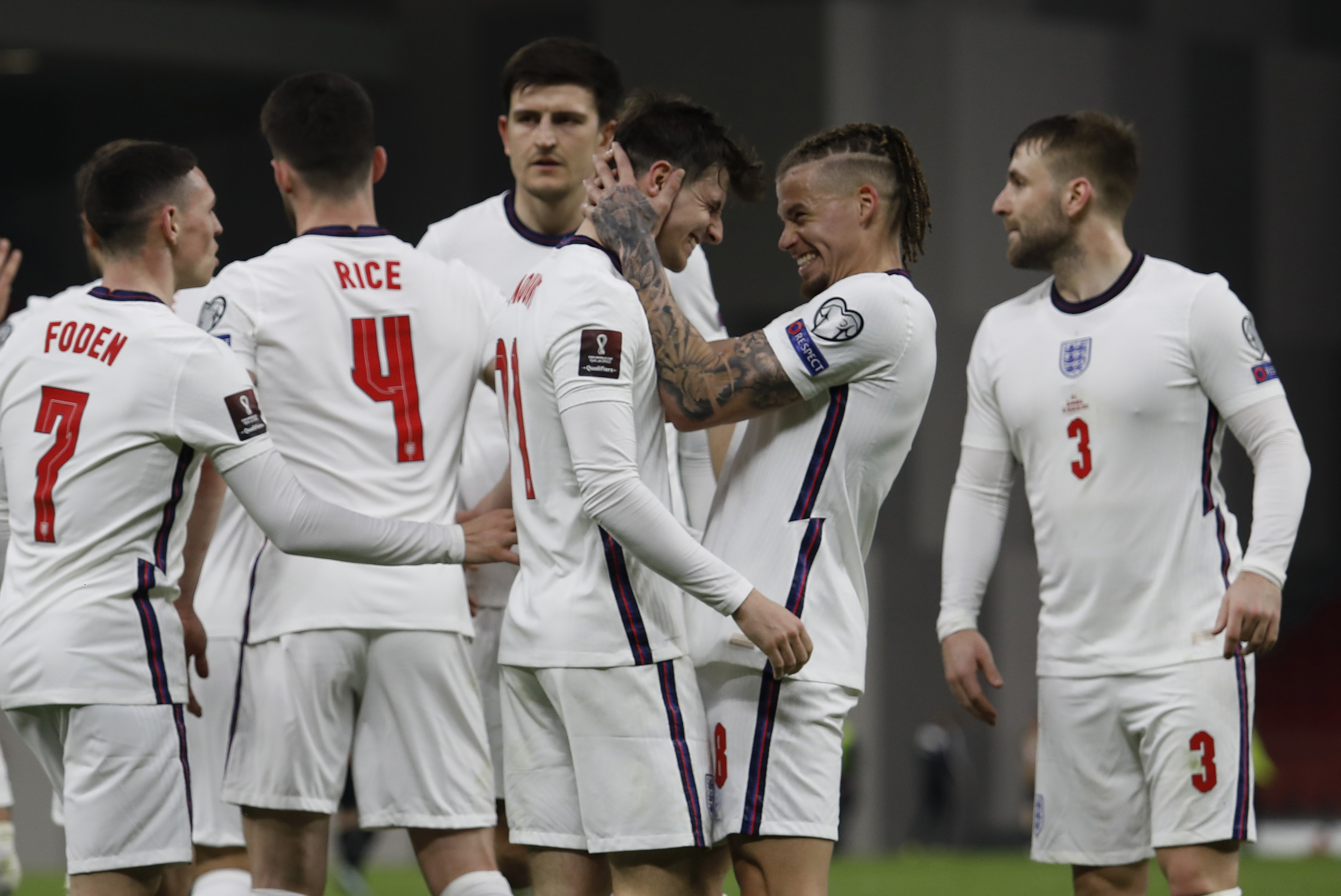 3月28日,英格兰队球员芒特(右三)与队友卡尔温·菲利普斯(右二)在比赛中庆祝进球。
