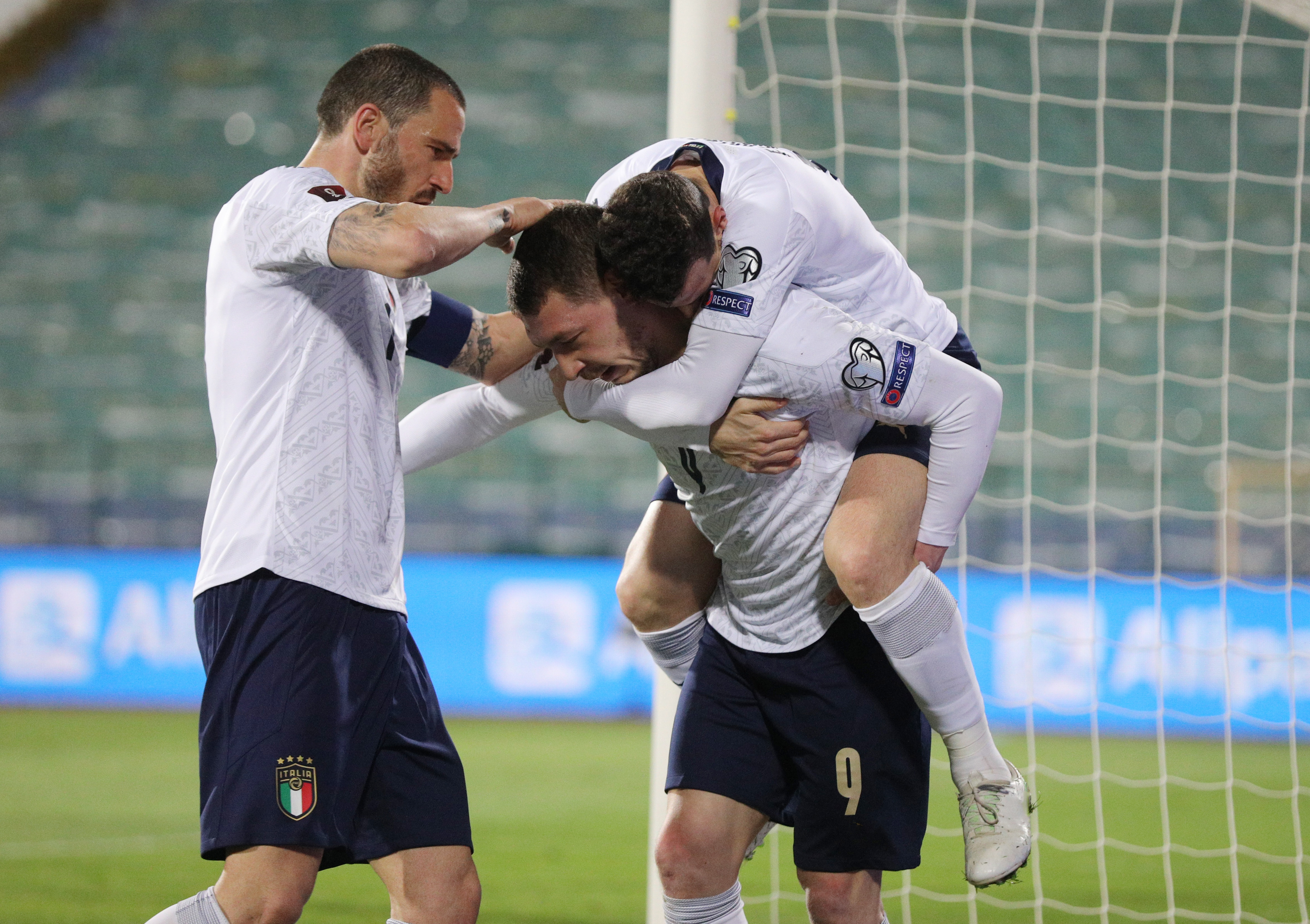 3月28日,意大利队球员贝洛蒂(中)在比赛中与队友庆祝进球。