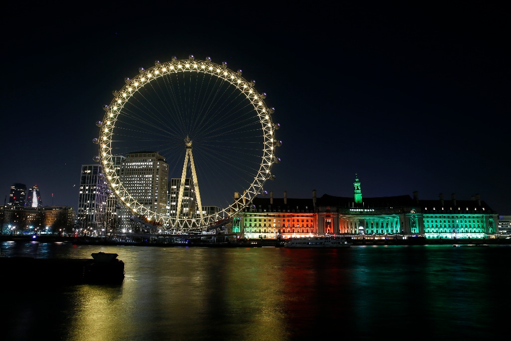 这是3月23日晚在英国伦敦拍摄的点亮黄色灯光的“伦敦眼”。(新华社记者韩岩摄)