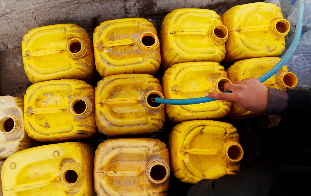 3月22日,一名当地居民在也门首都萨那灌装饮用水。(新华社发,穆罕默德摄)