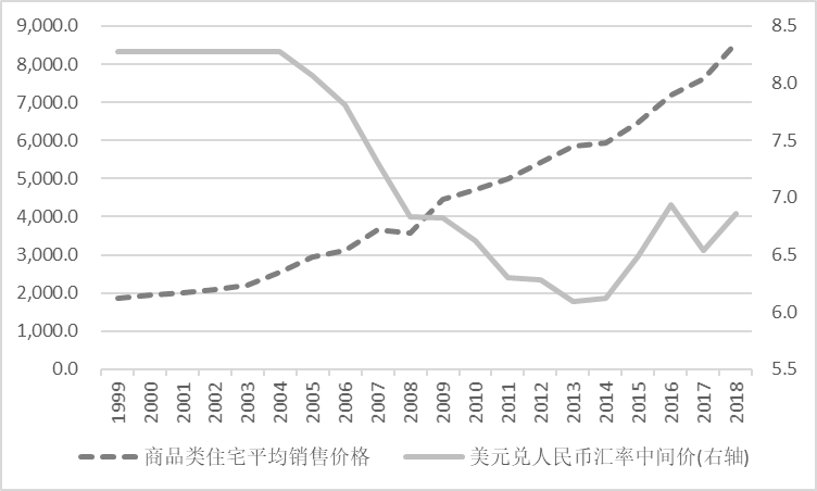 自1998年住房制度改革以来,中国经济高速增长以及旺盛的住房需求,带动国内商品住宅销售价格持续上涨。从长期趋势来看,由于经济强、货币强,人民币汇率在1994年汇率并轨之后的大部分时间里处于单边升值态势。