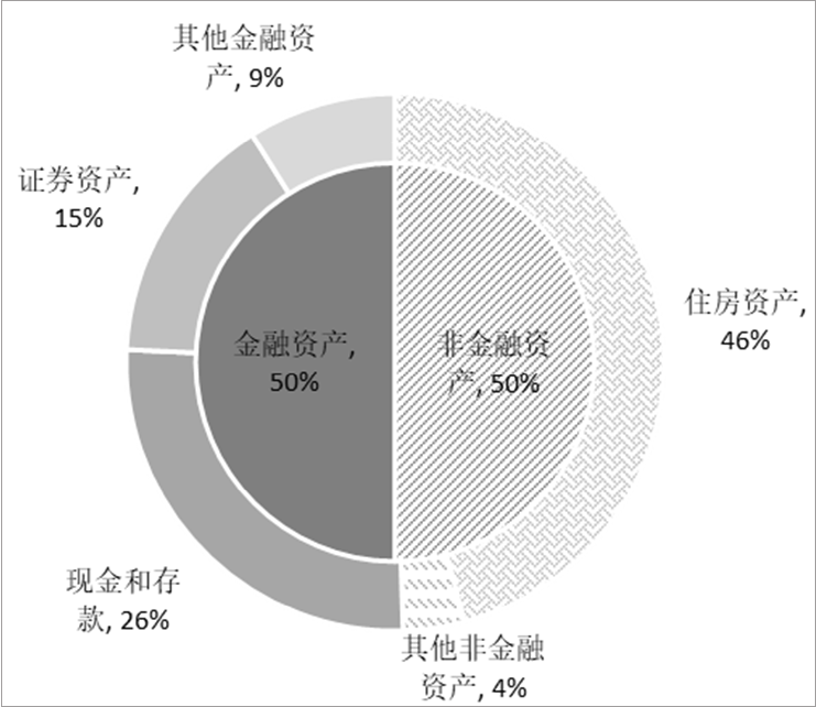 从居民资产分布情况来看,由于中国金融市场尚不发达,金融投资渠道匮乏,导致居民将其积累的大量财富投资于房地产领域。尤其是1998年住房制度改革以来,中国房价经历了大幅上涨,持有房屋的居民实现了财富的大幅增值,快速上涨的房价又进一步刺激了居民购房需求。因此,住房资产成为中国居民部门持有的主要资产类型,占到总资产的近一半份额(见图3)。