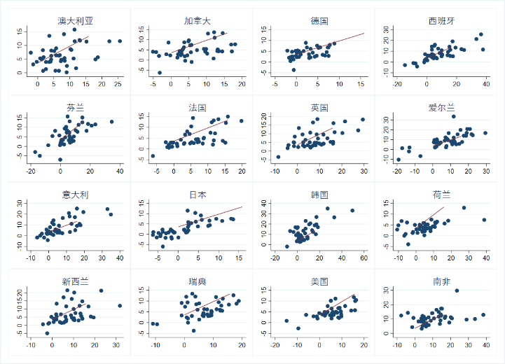 2010~2018年主要国家名义人均GDP增速和房价增速之间存在正相关关系,相关系数为0.4573且在统计上显著。1976~2018年期间主要国家名义人均GDP增速和房价增速的时间序列图显示,各国人均GDP增速和房价增速之间存在显著的正相关关系(见图1)。