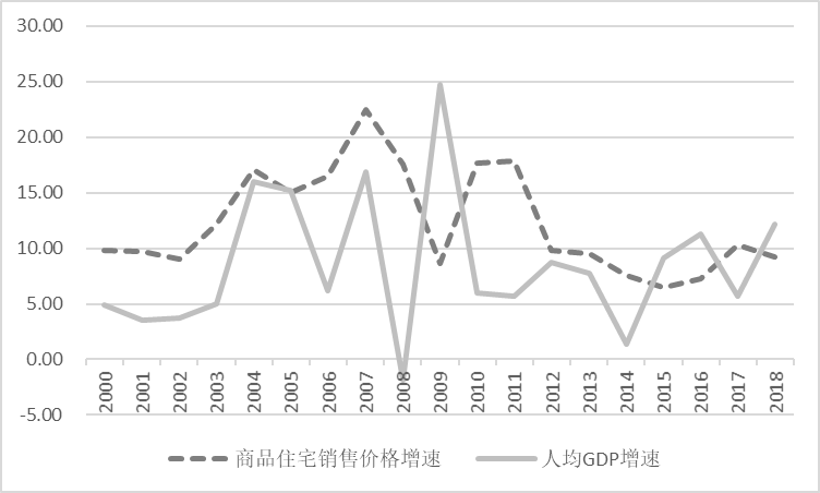 图2:中国人均GDP增速和住宅销售价格增速(%)