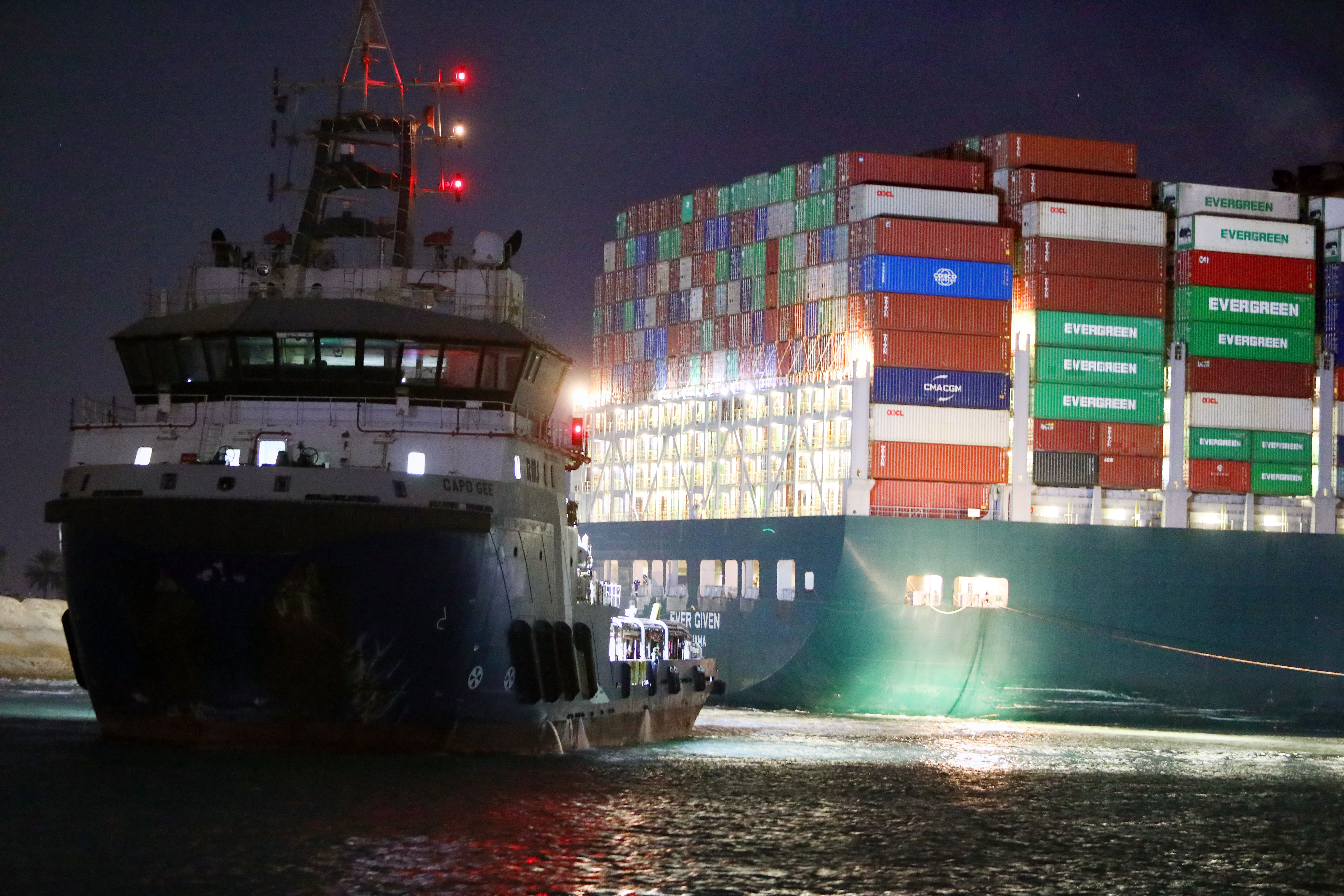报道援引一家船舶追踪定位网站的最新数据说,实时位置显示,这艘长约400米的货船船身已逐渐摆正,接近于和运河河岸平行状态。