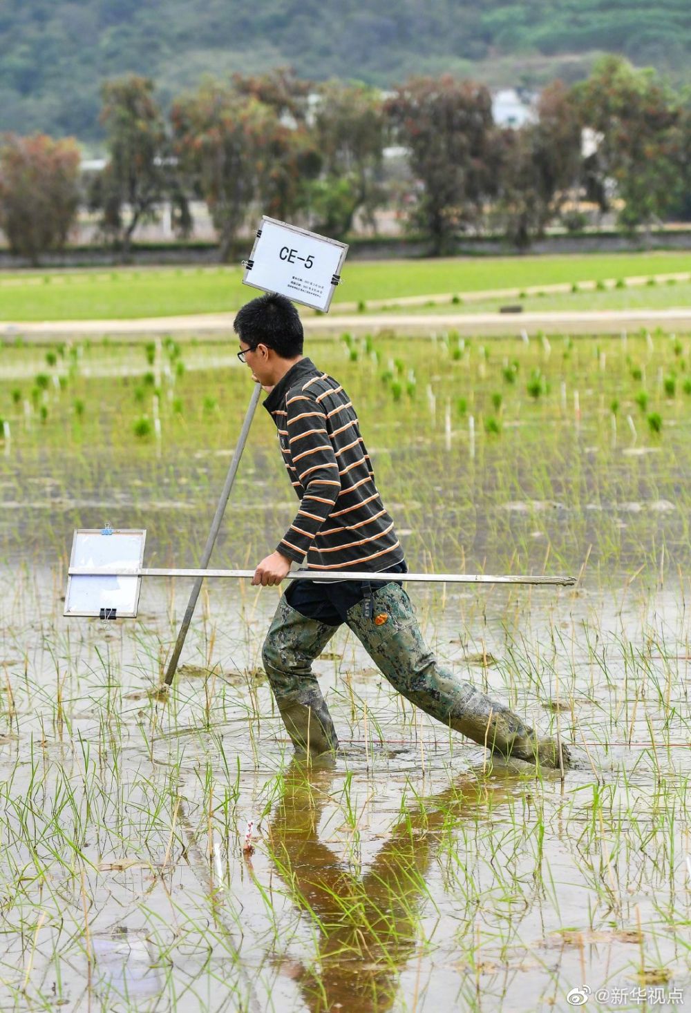 经过拉绳、摆秧等准备工作,嫦娥五号“天稻”被研究人员小心翼翼地插入田间。在同一块田地里,还有“长征五号”稻种、重离子辐照稻种,后期研究人员将分别对深空搭载、近地轨道搭载、地面模拟这三种稻种进行对照,以选育出最优品种。插秧之后,研究人员接下来会施肥、喷药等,预计5月底或6月初迎来抽穗期,7月上旬收获果实。