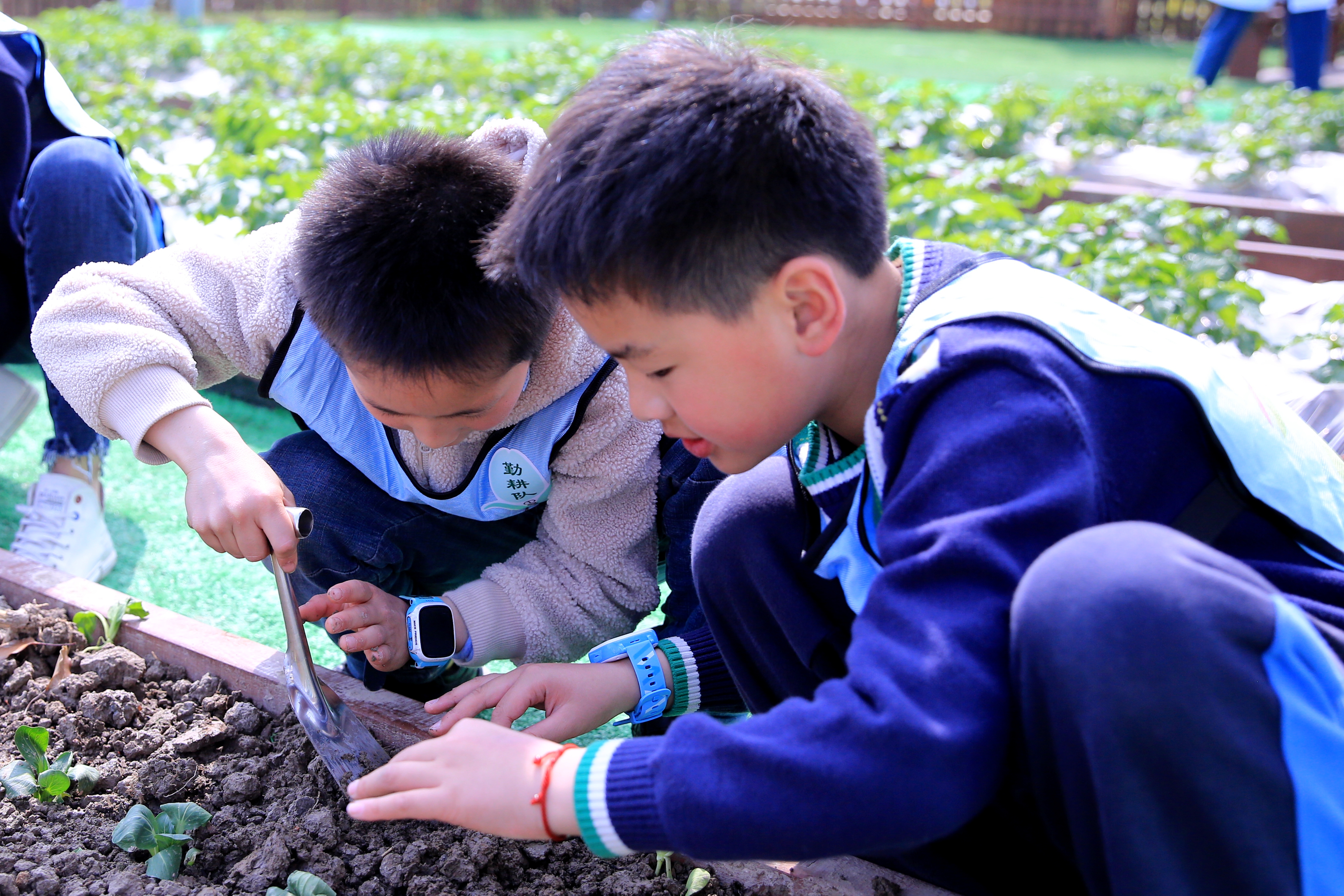 农事趣味挑战赛中,参赛小选手尝试菜苗种植。(上海市嘉定区华亭镇供图)