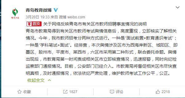 3月28日,多名网友发文称,青岛市教师招考考试疑似发生泄题。28日晚,青岛市教育局通过其官方微博“青岛教育微博”发布说明称,本次泄题事件涉及西海岸新区等六区市的教师招考考试,相关区市已迅速报警,同时向纪检监察部门通报情况。目前,公安部门已经介入。记者从相关渠道获悉,公安机关目前已抓获一名犯罪嫌疑人,案件正在办理中。详情>>>