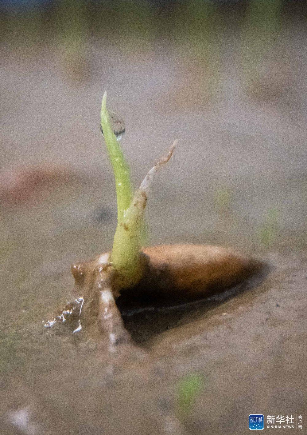 ↑嫦娥五号搭载的太空稻种在华南农业大学国家植物航天育种工程技术研究中心温室已经萌芽(3月4日摄)。