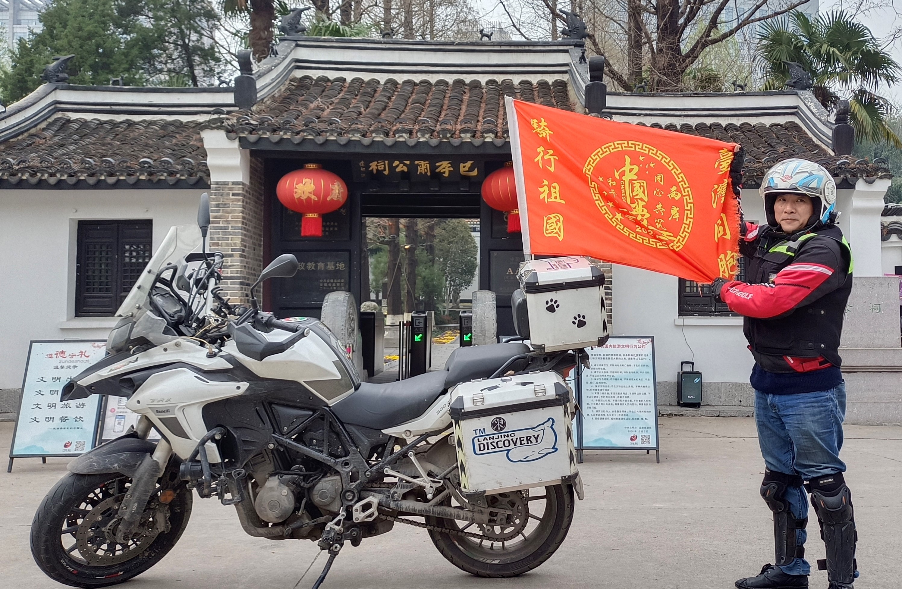 一个人,一辆国产摩托车,一面印有“台湾同胞骑行祖国,两岸同心共筑中国梦,和平统一”字样的红旗……截至目前,陈文仁已造访福州、南昌、长沙、武汉、合肥、杭州、南京等大陆城市。