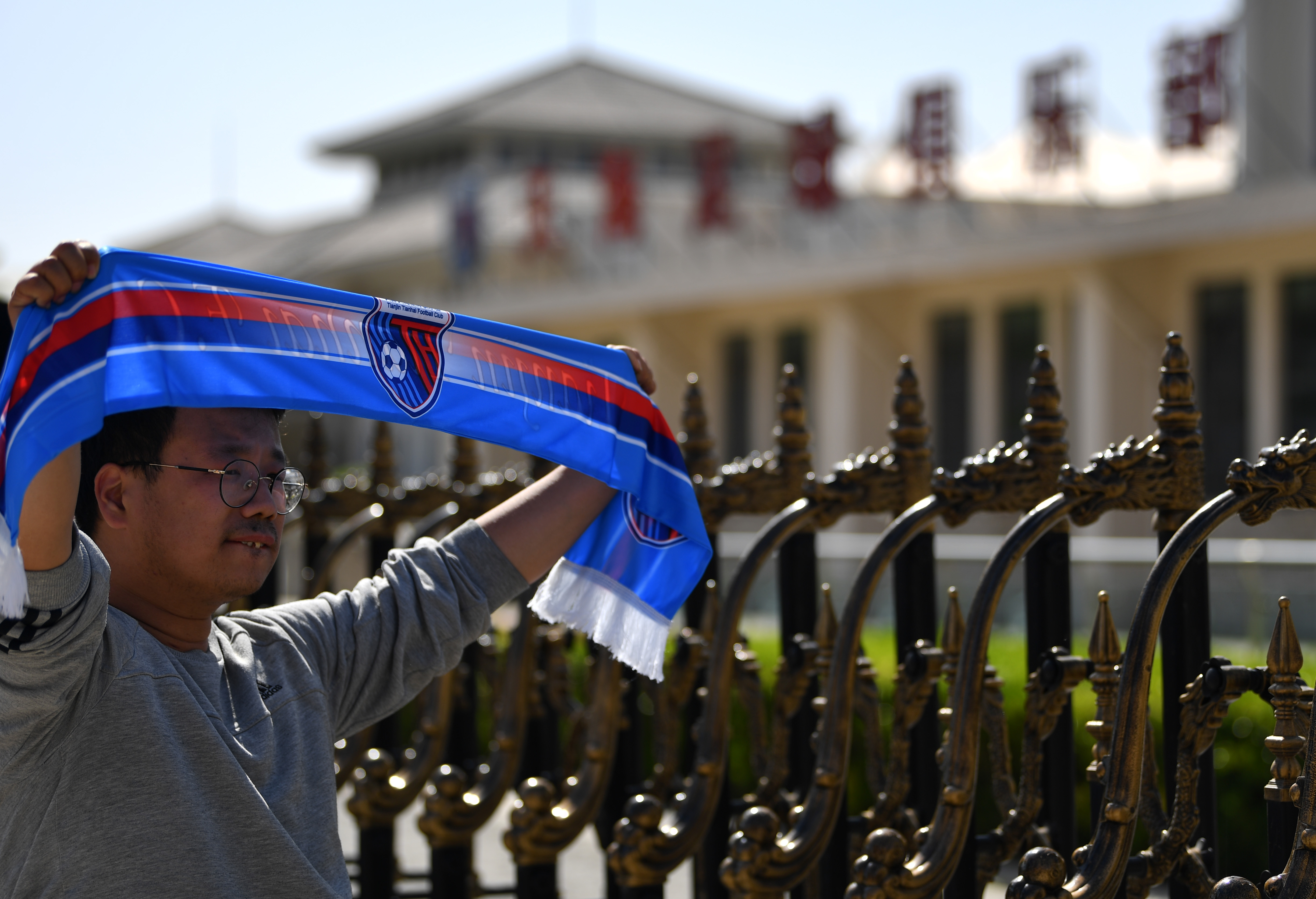 2020年5月12日,一名天津天海俱乐部球迷前来为球员送行。新华社记者 李然摄