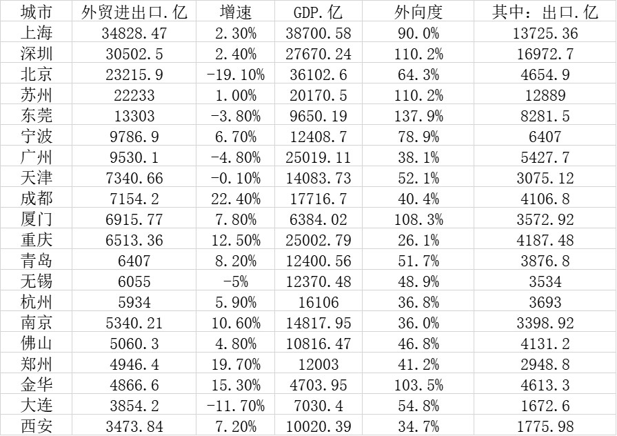 表:外贸总量20强城市数据(来源:第一财经根据各地公开数据统计梳理)