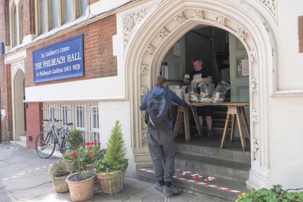 去年4月24日,在英国伦敦,一名男子领取免费餐食。(新华社)
