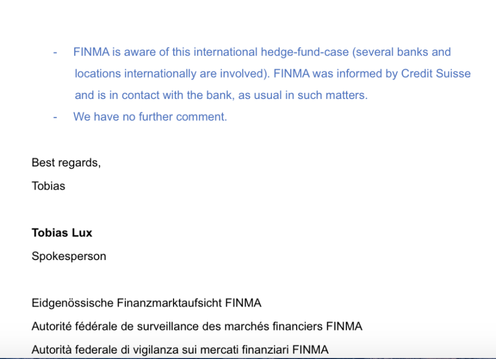 北京时间3月30日凌晨,瑞士金融市场监管局(FINMA)发言人Tobias Lux对中证君独家表示,FINMA注意到了这一国际对冲基金事件。瑞士信贷通知了FINMA相关情况。目前,FINMA已与瑞士信贷就相关事件联系。