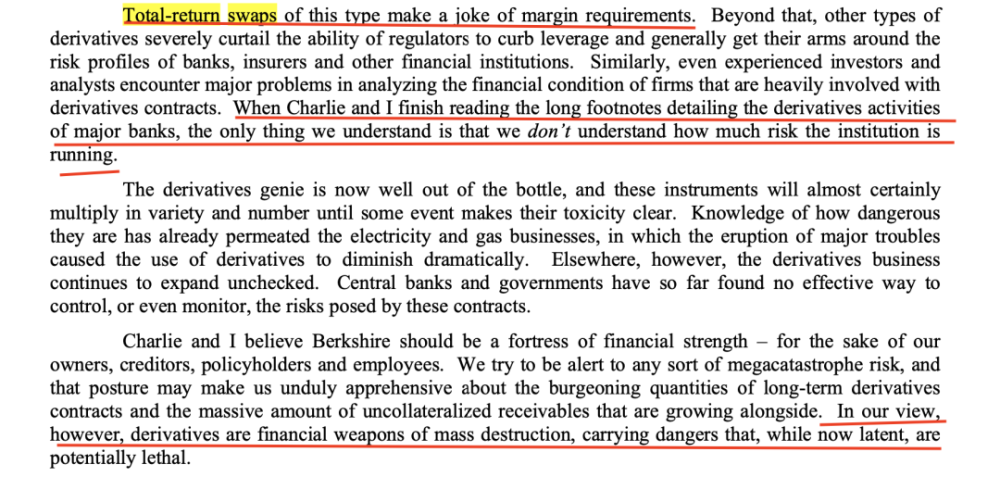 他写道,“(这种)总收益互换使得保证金要求像个笑话。当查理和我读完主要银行财务报告脚注中描述的衍生品活动时,我们唯一能理解的就是,我们完全不理解这些活动中蕴藏了多少风险……我们认为衍生品是金融领域的大规模杀伤武器,它们的风险目前来看可能是潜在的,但可能是致命的。”