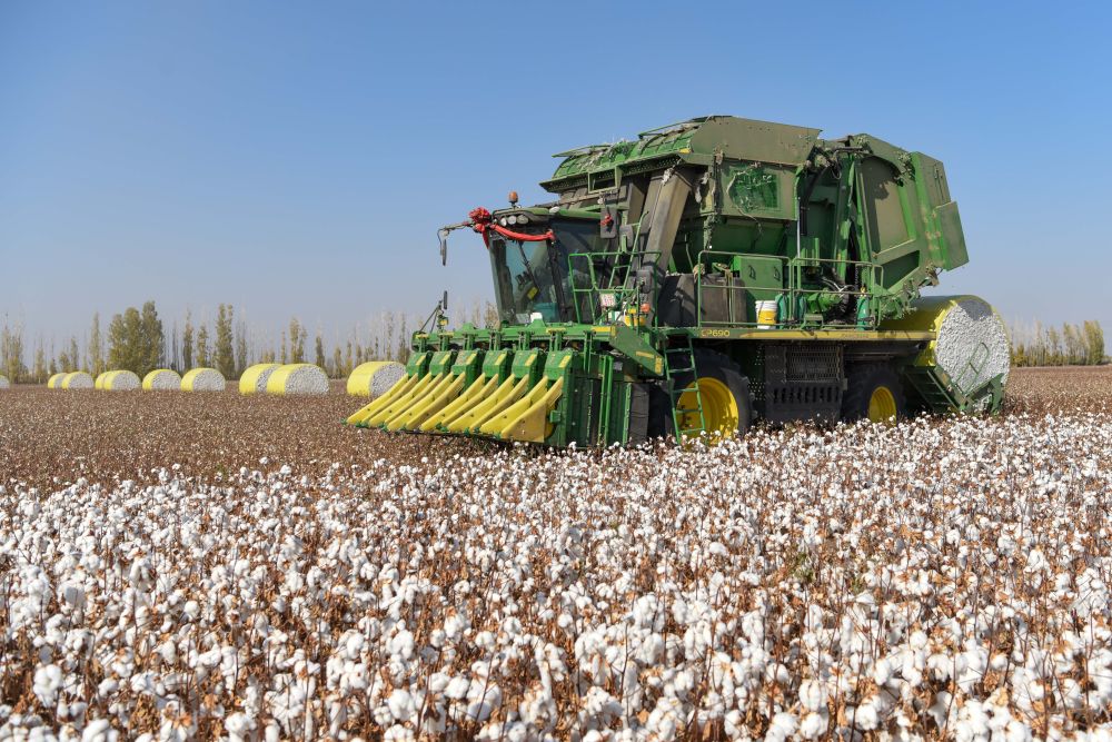 2020年10月17日,在新疆玛纳斯县乐土驿镇文家庄村,一台采棉机在棉田里采摘棉花。新华社记者丁磊摄