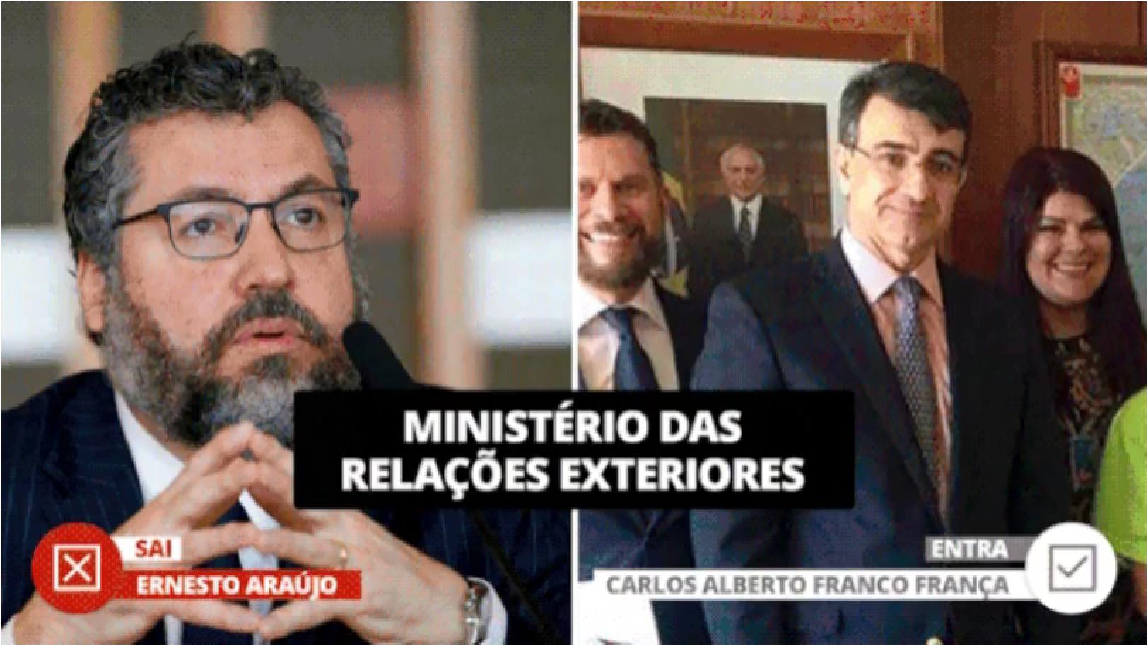 △埃内斯托·阿劳若(图左)辞去巴西外交部部长,由曾担任总统特别顾问委员会的负责人卡洛斯·弗朗萨(图右)接任这一职务