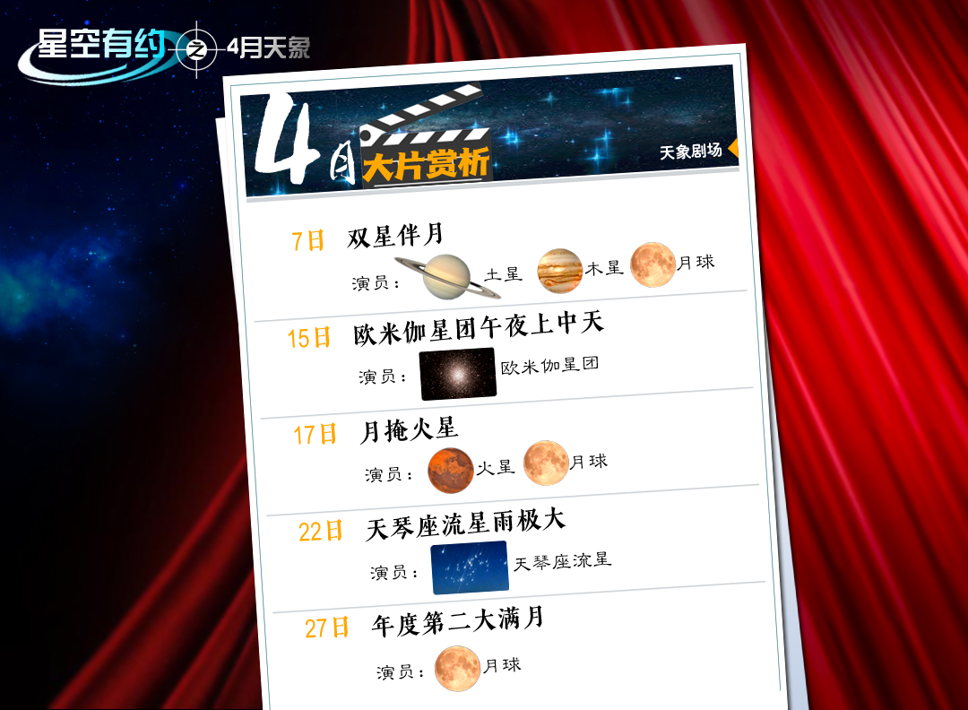 4月的“天象剧场”将上演哪些“大片”?天文科普专家介绍,双星伴月、欧米伽星团午夜上中天、月掩火星、天琴座流星雨极大、年度第二大满月等“佳片”将轮番上映。