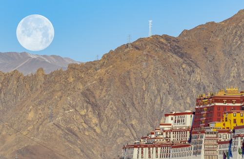 这是2020年3月10日在拉萨市布达拉宫附近拍摄到的年度第二大满月。新华社发