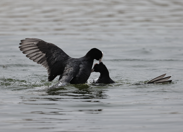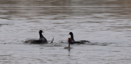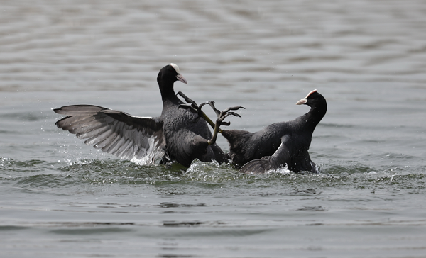 3月28日,在青海西宁北川河湿地公园有观鸟爱好者拍到国家“三有”保护动物白骨顶鸡为争交配权在水中激烈打斗的场景。