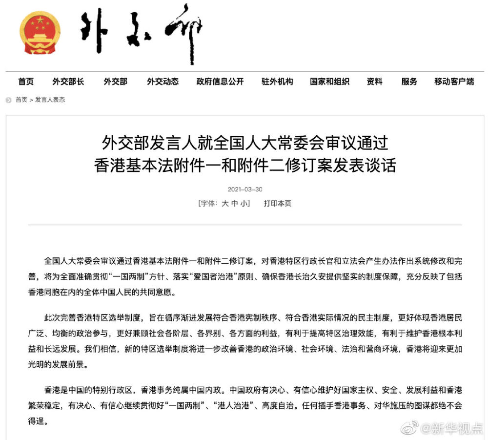 【外交部发言人就全国人大常委会审议通过香港基本法附件一和附件二修订案发表谈话】全国人大常委会审议通过香港基本法附件一和附件二修订案,对香港特区行政长官和立法会产生办法作出系统修改和完善,将为全面准确贯彻“一国两制”方针、落实“爱国者治港”原则、确保香港长治久安提供坚实的制度保障,充分反映了包括香港同胞在内的全体中国人民的共同意愿。
