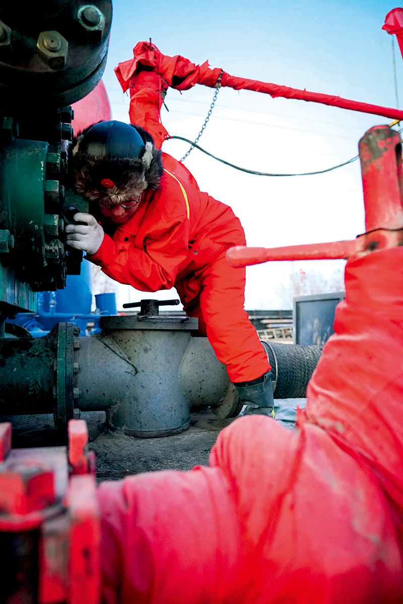 大庆油田1205钻井队副队长贾华龙在大庆油田1205钻井队钻井平台作业(2020年12月28日摄) 王松摄/本刊