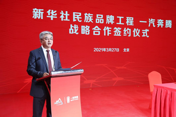 新华网董事长、总裁田舒斌在致辞中表示,“2019年8月31日,新华社与中国一汽签署战略合作协议,为推动构建中国汽车工业发展新生态、打造世界级中国汽车民族品牌做出了有益尝试。今天,新华社民族品牌工程与一汽奔腾签署战略合作协议,新华社将充分利用丰富的媒体资源、强大的传播渠道和高端的智库力量,依托新华社16家专业机构形成的‘民族品牌工程’综合服务体系,不断提升一汽奔腾品牌美誉度,让世界上更多的人了解一汽奔腾、喜爱一汽奔腾,让一汽奔腾汽车驶入千家万户,让一汽奔腾的精神气质深入人心。”