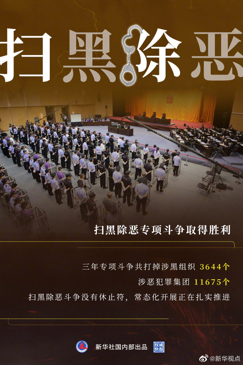 【权威快报 | 扫黑除恶专项斗争取得胜利】全国扫黑除恶专项斗争总结表彰大会29日在京举行。三年来,专项斗争取得了胜利,实现了预期目标。全国共打掉涉黑组织3644个,涉恶犯罪集团11675个。抓获犯罪嫌疑人23.7万人,缉拿目标逃犯5768人,境内目标逃犯全部缉拿归案,境外目标逃犯到案率达88.7%,43144名涉黑涉恶违法犯罪人员投案自首。社会各界普遍认为,开展扫黑除恶专项斗争是党的十九大以来最得人心的大事之一。(记者刘奕湛、任沁沁,海报设计张晨光)