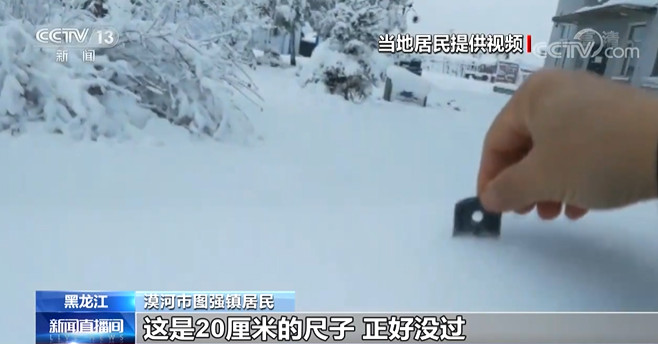 29日清晨,在漠河市图强镇,晨练的居民在厚厚的积雪中举步维艰,当地积雪最厚达到22厘米。
