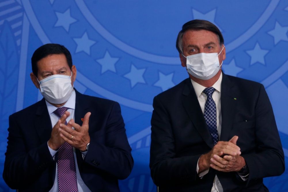 2020年8月19日,巴西总统博索纳罗(右)和副总统莫朗在位于巴西利亚的总统府出席经济措施批准仪式。(新华社发,卢西奥·塔沃拉摄)