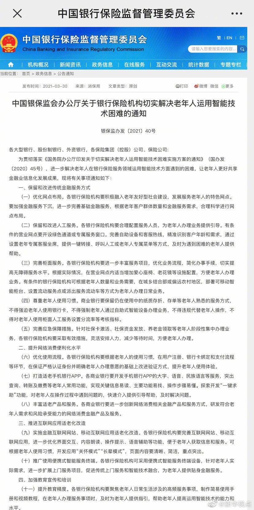 【不得强迫老年人使用银行卡:这些举措,让咱爸妈放心去银行办业务】智能化浪潮下,老年人的金融需求如何满足?银保监会30日对外发布通知,聚焦银行保险服务领域涉及老年人的高频事项和服务场景,提出16条措施,要求加强金融服务下沉,发展服务老年人的特色网点;尊重老年人使用习惯,保留仍在使用中的纸质存折、存单等老年人熟悉的服务方式,不得强迫老年人使用银行卡,不得强制老年人通过自助式智能设备办理业务;丰富适老产品和服务等。(记者李延霞)