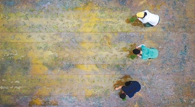29日,研究人员在插种嫦娥五号搭载的太空稻秧苗(无人机拍摄)。