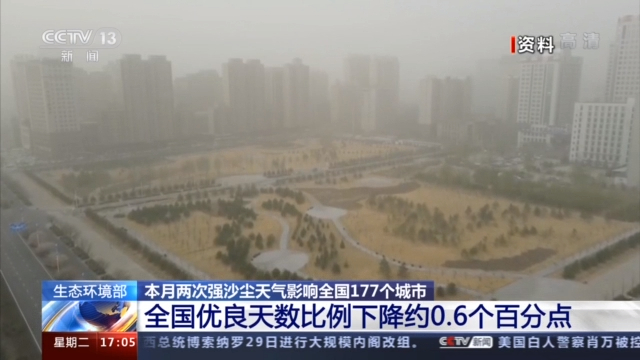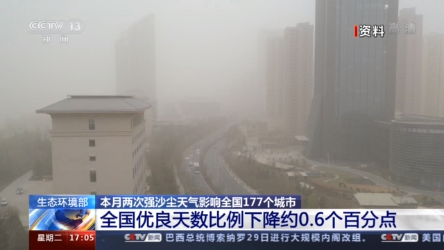 强沙尘天气对我国环境空气质量带来严重影响。根据国家环境空气质量监测网数据,沙尘过境期间,我国北方多地空气质量达到严重污染。从沙尘影响程度看,全国共计177个地级及以上城市受到两次强沙尘天气过程影响,导致空气质量超标702天,按全年计算,全国优良天数比例下降约0.6个百分点。