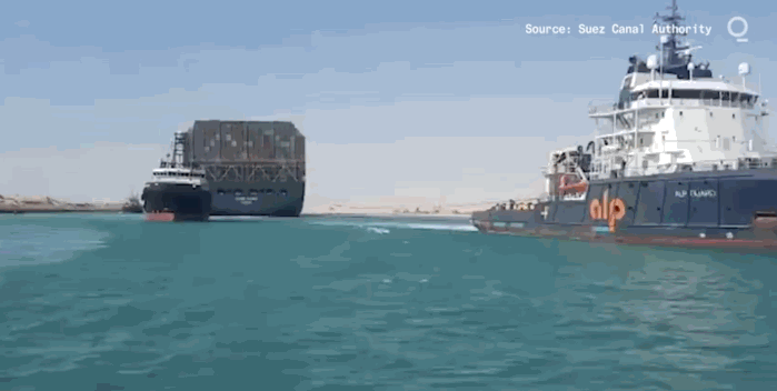 当地时间3月29日下午,在救援队伍的努力下,从23日开始堵塞苏伊士运河航道的“长赐”号货轮已成功脱浅并被拖至大苦湖进行技术检查,苏伊士运河航道重新开始恢复通行。